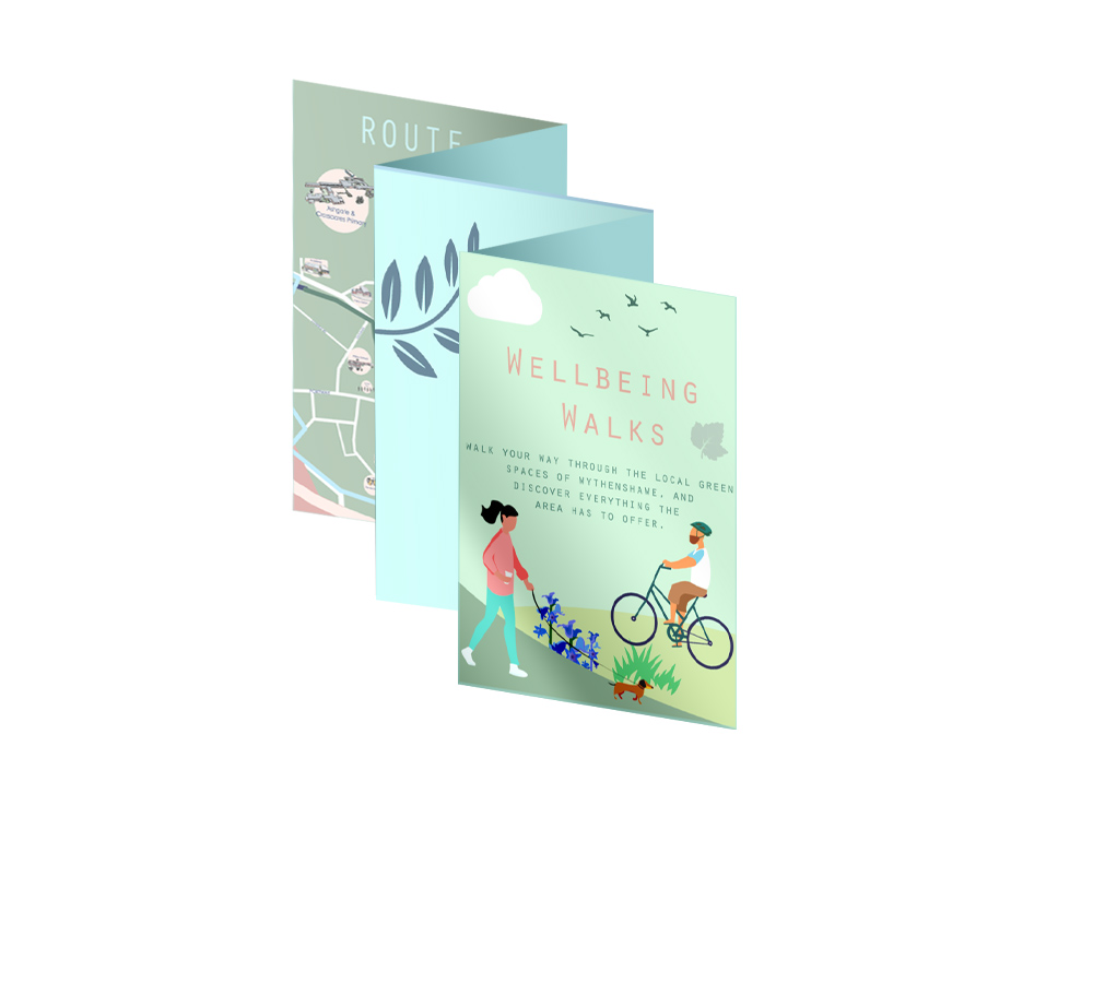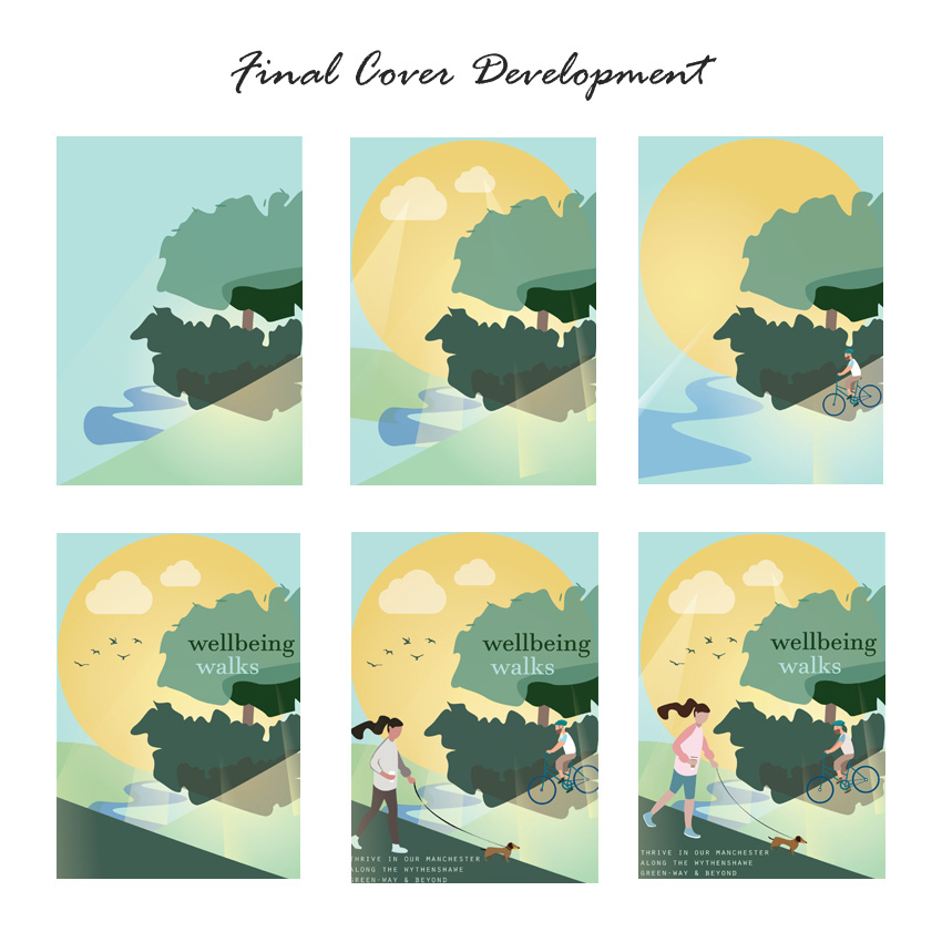 I have updated project managers/partners during design development. Once we were happy with a cover, I played with design potential by introducing alternative colours, clothing and fonts. I then moved onto furthering depth and detail, adding sun beams, rivers, drawing on outdoors, nature and wellbeing. I wanted the visuals and colours for the map and pages to extend through each aspect of the booklet; the fun challenge was finding the best balance of colours and composition. Producing this project using Adobe Illustrator provided many solutions and eased development exploration e.g., ability to freehand vector visuals directly onto art boards, easily alter pantones/pallets, introduce temporary artboards for comparrision. This in hand with Adobe Photoshop has made my design approach much more professional and stress free.