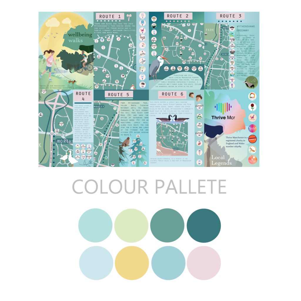 I discussed in-depth details with the Thrive Manchester program directors in advance; noted points on how the booklet would fold and read e.g., landmark symbols, legend, route colours, etc. The design side has been freeing, generating my inspired visions while implementing suggestions and preferences from directors, it has been a very smooth collaboration.